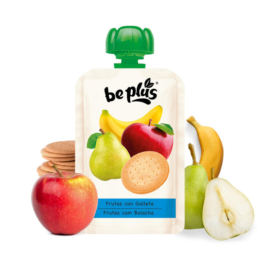 BePlus Frutas con Galleta 120g - Pouch Infantil desde 6 Meses Puré de Manzana, Plátano y Pera con Galleta María Pack 7x120g