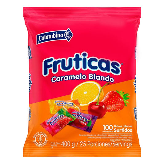 Caramelo Masticable Blando con Relleno Liquido. 3 Sabores: Cereza, Fresa y Naranja. 100 Unidades x Bolsa. Fruticas Colombina.
