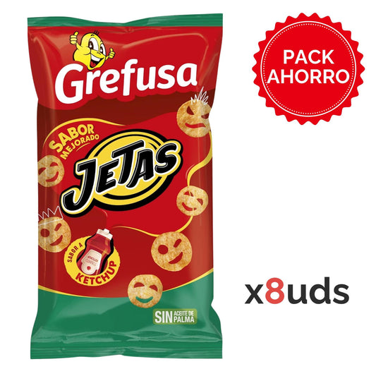 Jetas Snack de Patata con Sabor Ketchup - Pack de 8 Bolsas de 70g ? Aperitivo Crujiente con Forma de Caritas ? Divertido y Sabroso para Compartir