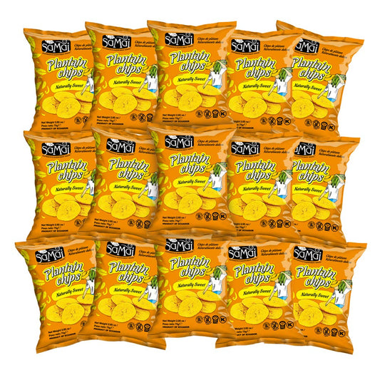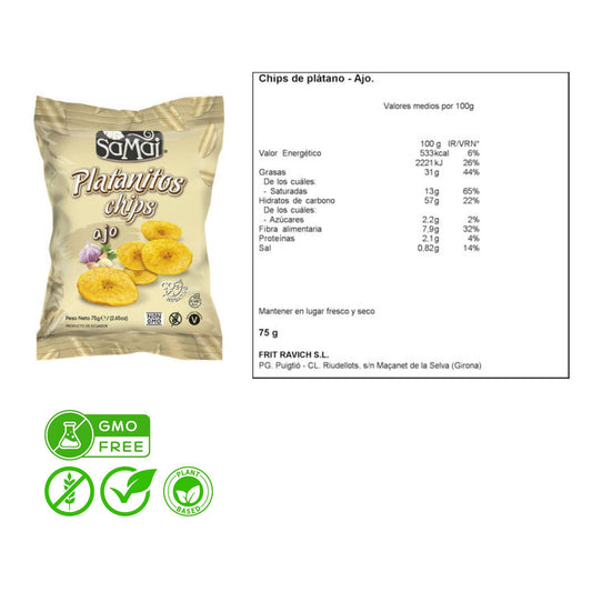 Samai Chips de Pl?tano con Ajo 75g | Pack 15 uds | Snack Vegano Crujiente | Sin Gluten | Fuente de Fibra