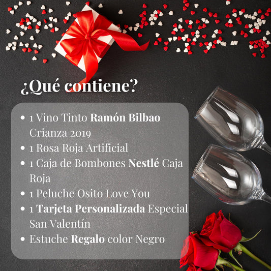 Pack Regalos Originales Románticos | Incluye Vino Ramon Bilbao + Bombones San Valentin Caja Roja Nestle + Osito Peluche LOVE + Rosa