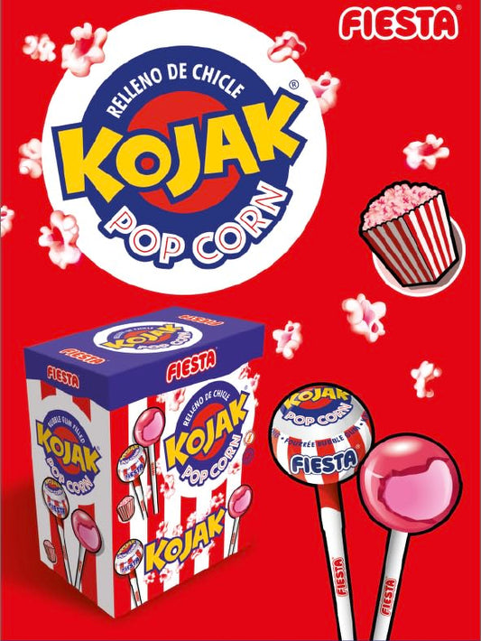 FIESTA Kojak Caramelo con Palo Sabor POP CORN Relleno de Chicle - Caja de 100 unidades - Kojak Sabor Palomita de Maiz