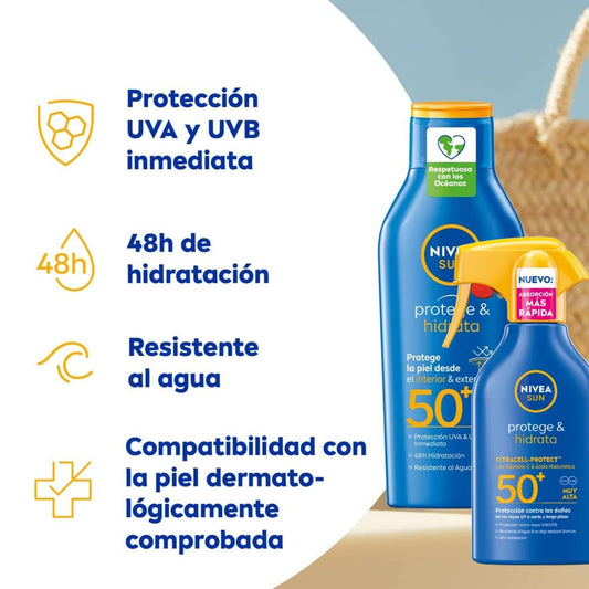 Pack Crema Solar Nivea Sun SPF 50 + Bolso de Yute de Regalo - Protector hidratante y resistente al agua con protecci?n UVA/UVB (Pack Crema + Spray)