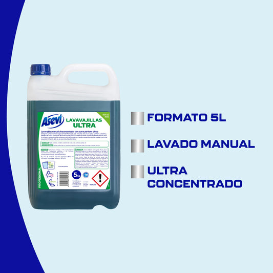 Asevi Lavavajillas Líquido Ultra Profesional - Detergente Lavaplatos Manual Ultraconcentrado - Gran Poder Desengrasante - 5 Litros