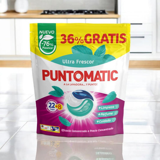 PUNTOMATIC | Cápsulas Tricámara Frescor | Detergente Lavadora para Ropa Blanca y de Color | Quitamanchas | 22 +8 lavados Pack 6 Unidades 180 Lavados