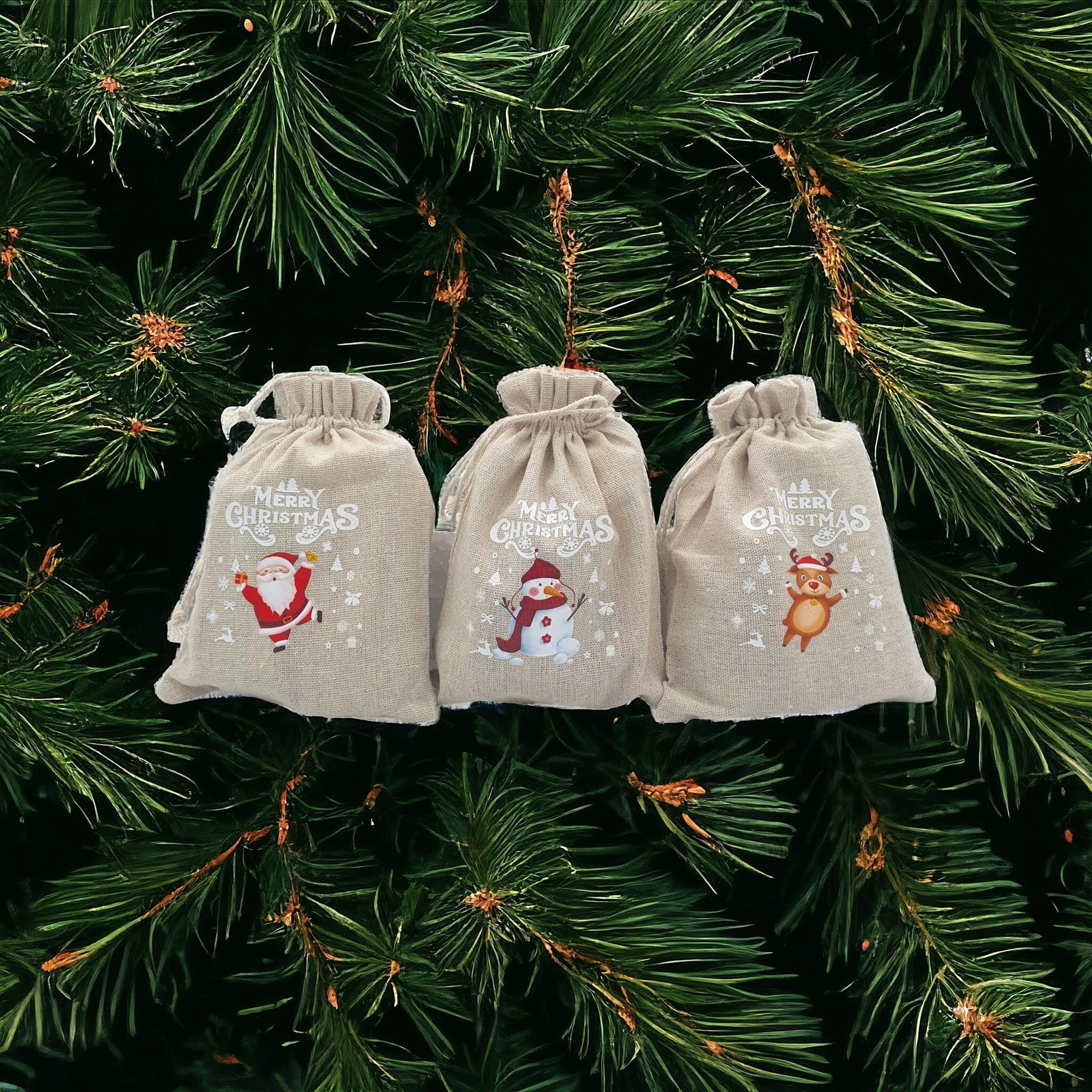 Bolsas de Lino con 6 diseños distintos de Navidad, rellenas de chocolates y chuches. Listas para Colgar en el árbol de Navidad, Chimenea o para regalar a los mas peques de la casa o no tan peques.