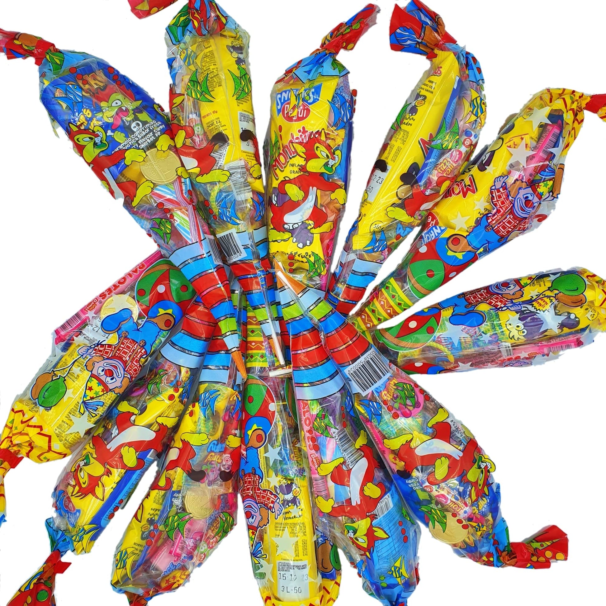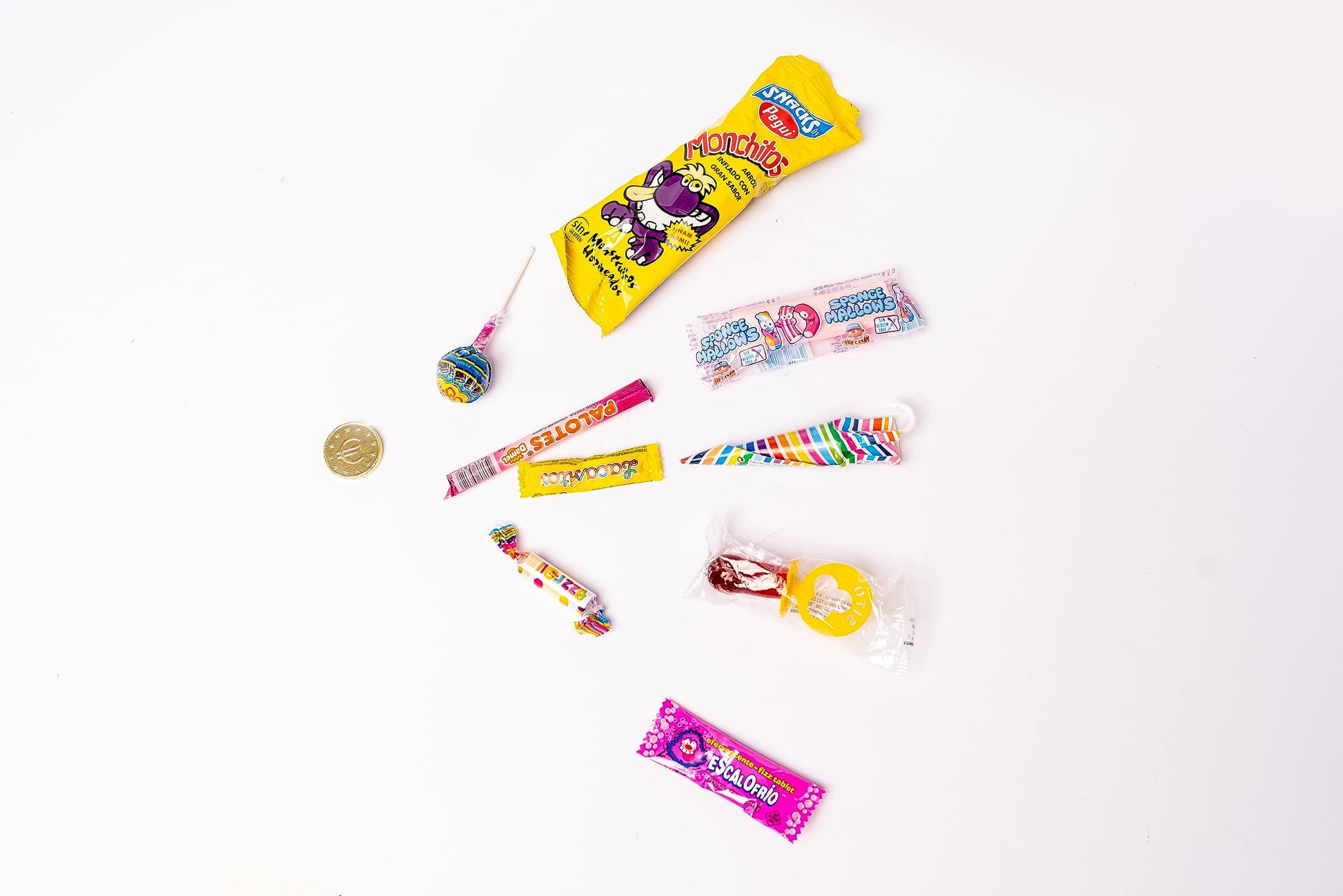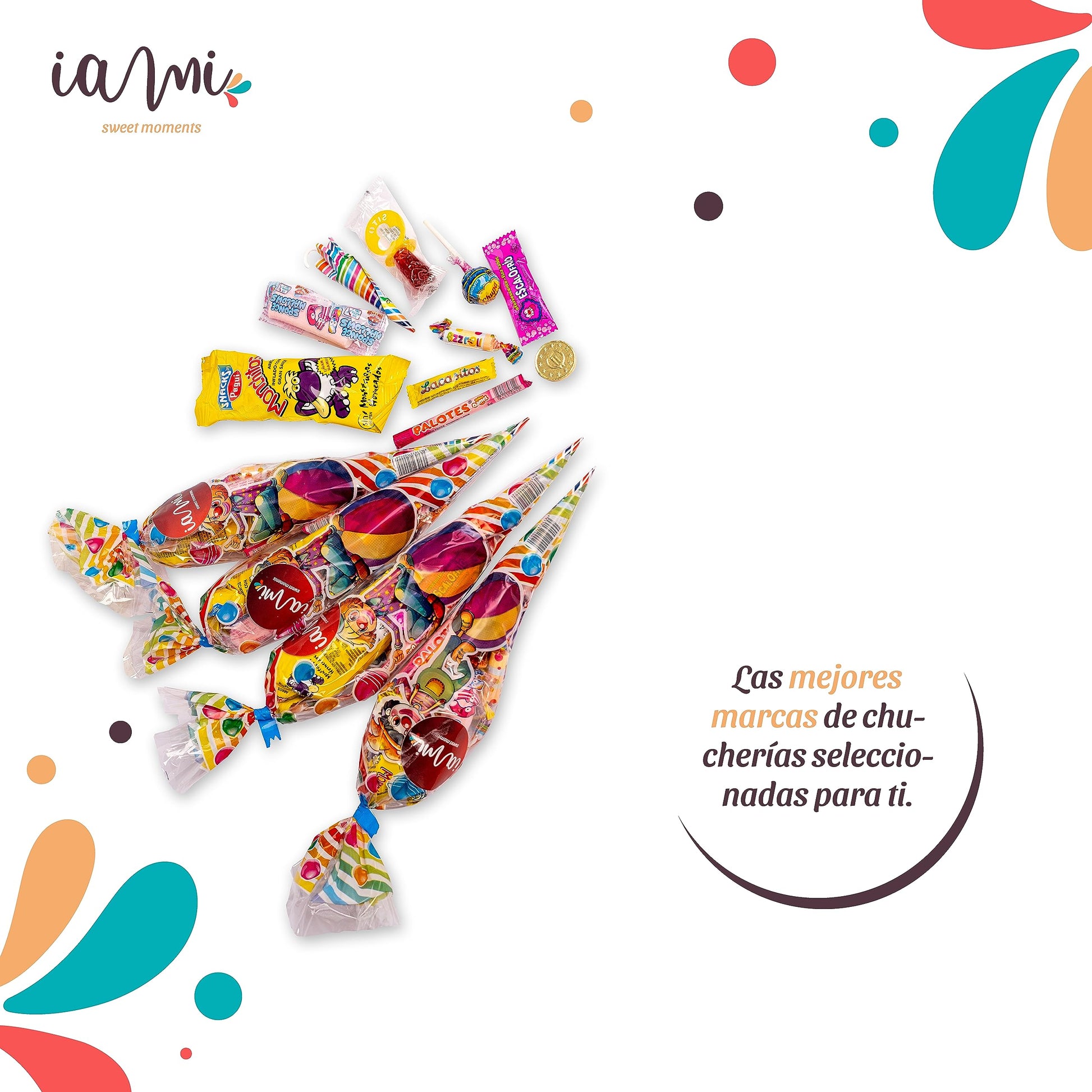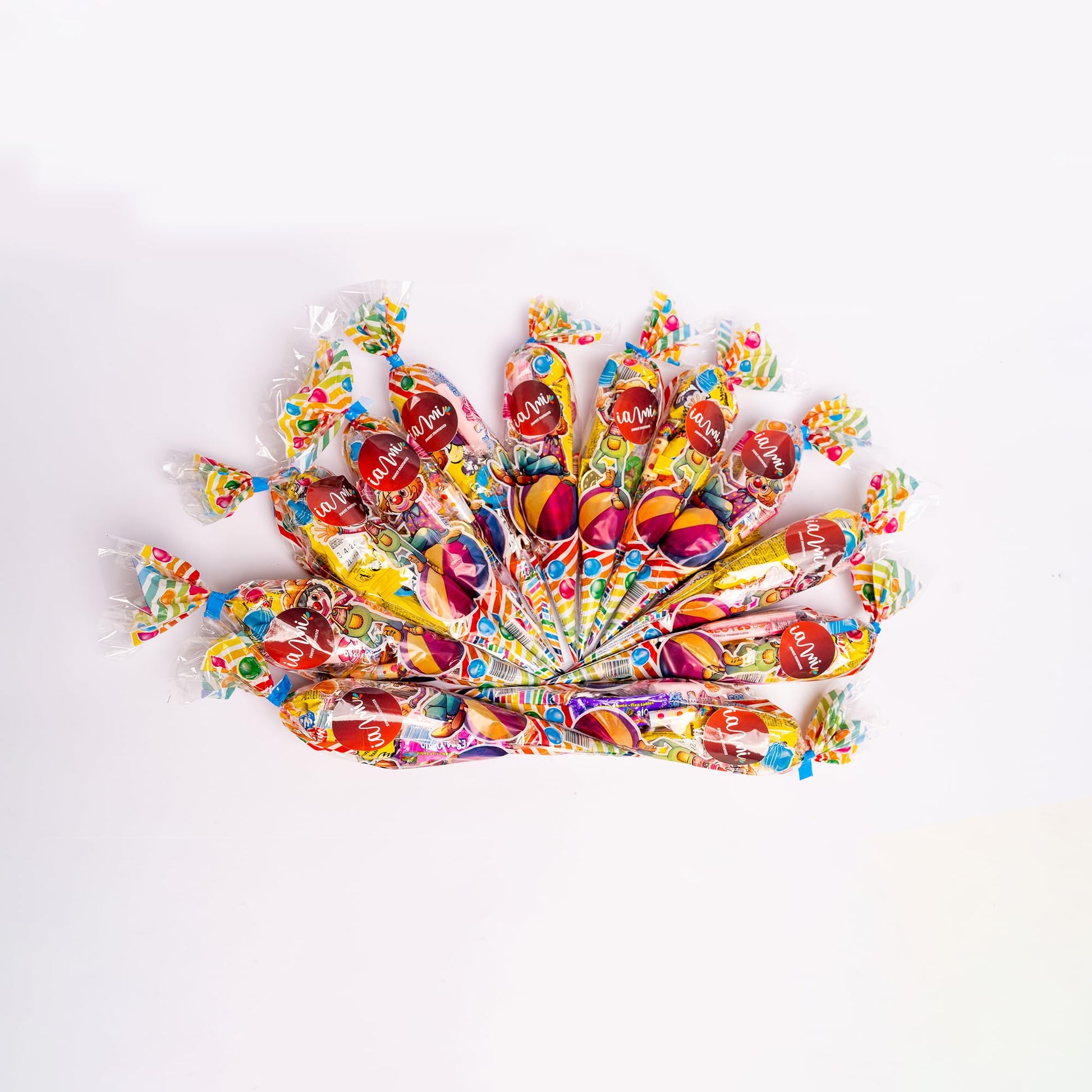 - [Variedad]: Caramelos con Palo Chupa, Palotes, Lacasitos o Chocolatinas, Arroz Inflado, Pica Picas, Paraguas de Chocolate, Monedas de Chocolate, Chupetes de Caramelo y Nubes Envueltas.