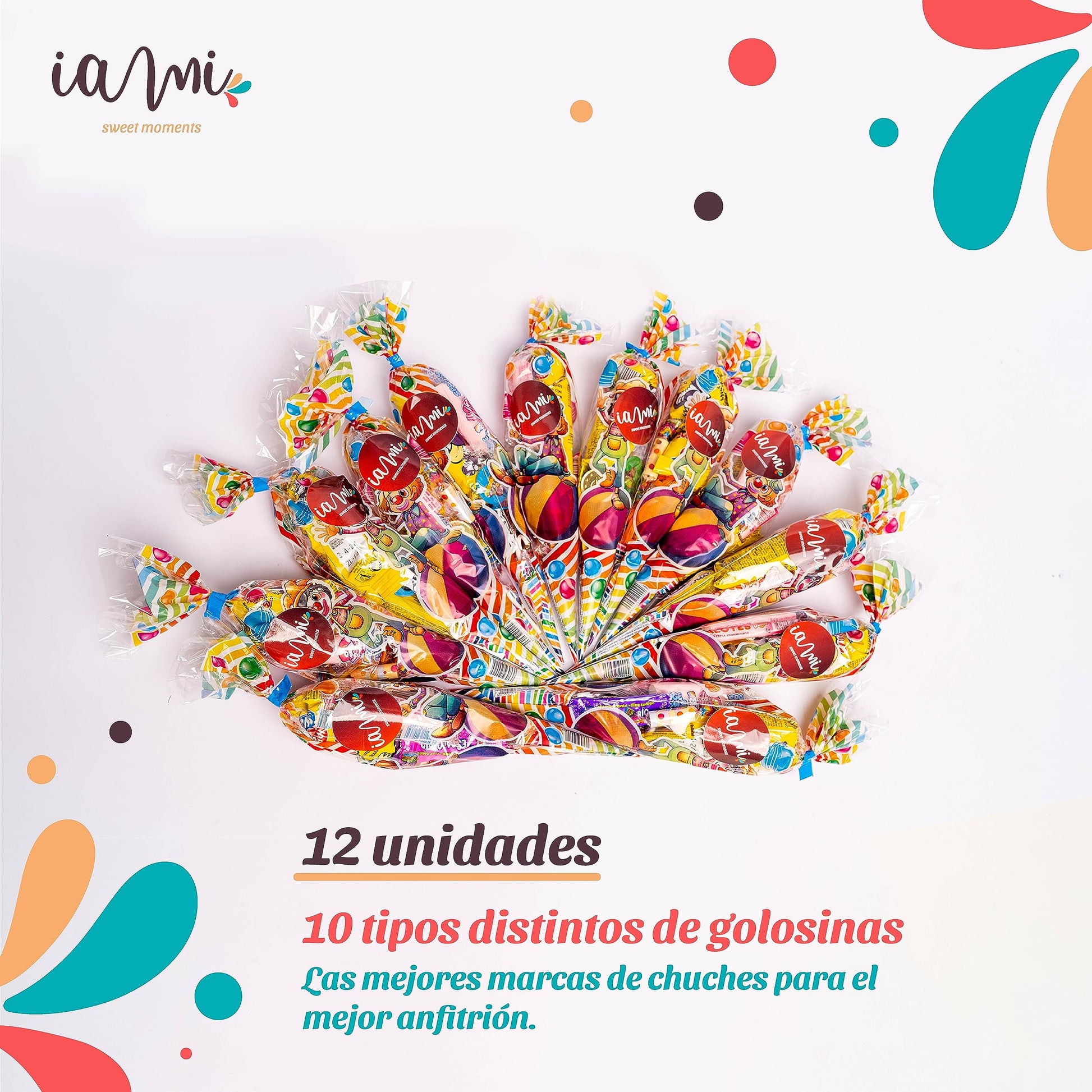 IAMI Bolsas Chuches. 12 Conos Rellenos de Golosinas. Cada Cucurucho lleva 10 Chuches Surtidas. Bolsas de Cumpleaéos Listas para Repartir