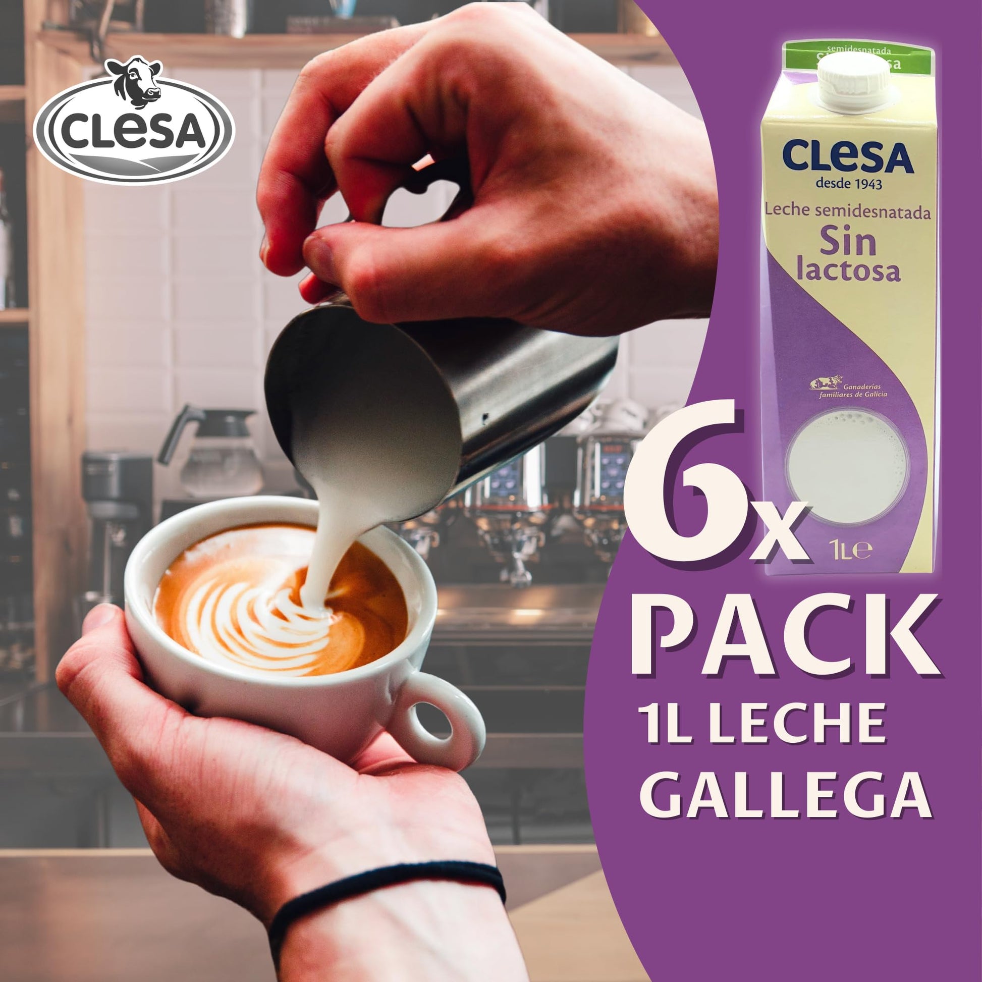 Leche Clesa SIN LACTOSA Semi Desnatada - 6 Bricks de 1 Litro - 100% Leche Gallega - Tapon Anti Goteo - 6 Litros Leche Sin Lactosa [CLESA]